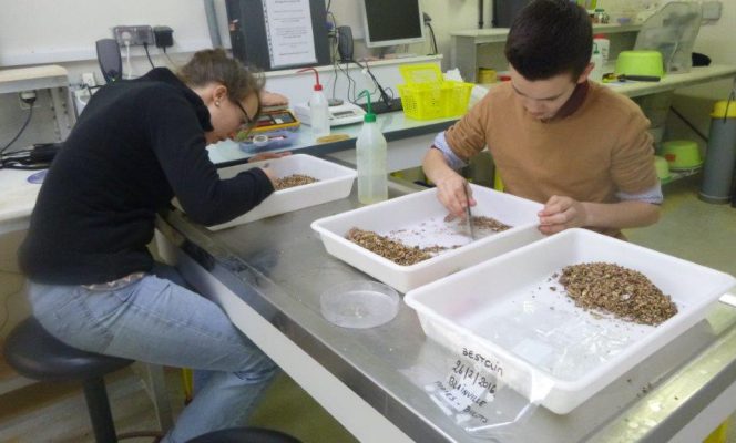 Des échantillons de buccins et de proies ont été prélevés sur deux sites différents au large de Blainville et de Chausey et à trois périodes de l’année (février, juin et octobre 2016). L’UMR BOREA a testé 3 techniques pour identifier les sources majeures d’alimentation du buccin : l’analyse directe au microscope