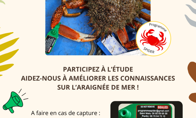 Dans le cadre de l’étude scientifique SPIDER « Suivi des Populations d’araignées de mer dans le golfe normano-breton et Identification et Développement de solutions pour limiter l’Effet de la pRédation en mytiliculture », des opérations de marquage d’araignées de mer sont prévues. Une centaine d’araignée de mer ont déjà été marquées en baie de la Fresnaye et en baie d’Arguenon, et le marquage sur la côte Ouest du Cotentin va débuter prochainement.