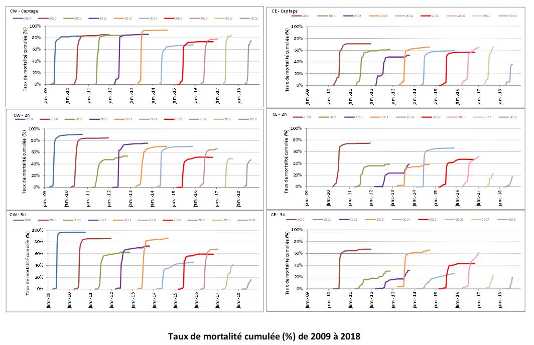 Les résultats présentés ici, concernent le suivi de 3 lots distincts provenant chaque année de la même origine, qu’il s’agisse du site de captage ou de l’écloserie. Ils font partie du panel initial du réseau d’observation depuis sa création.