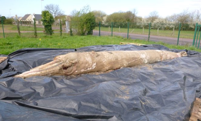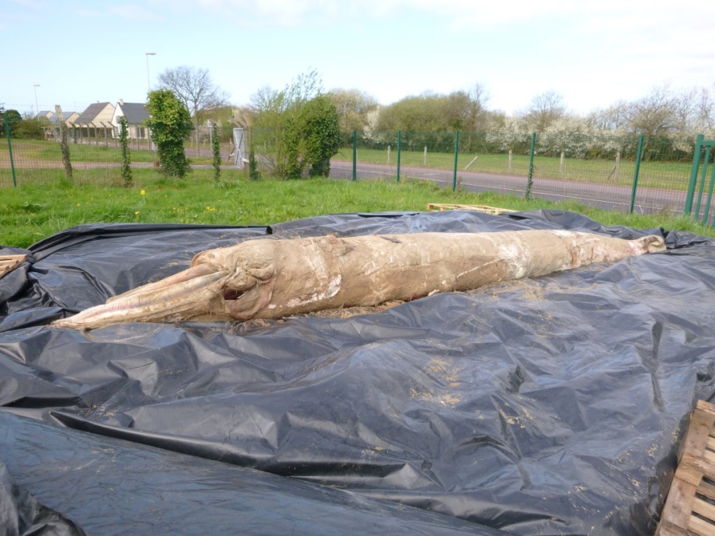 Avec l’aide d’un autre correspondant du RNE (Réseau National d’Echouage), l’observation nous a permis d’affirmer que c’était un rorqual commun. L’état avancé de décomposition de cet animal ne nous a pas permis d’expliquer la, ou les cause(s) de la mort. Mais l’examen réalisé a permis de connaître le sexe et un âge très approximatif : c’était une jeune femelle de 5 ou 6 ans qui mesurait 7,10 mètres.