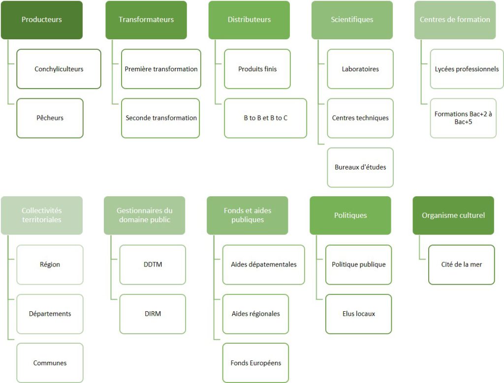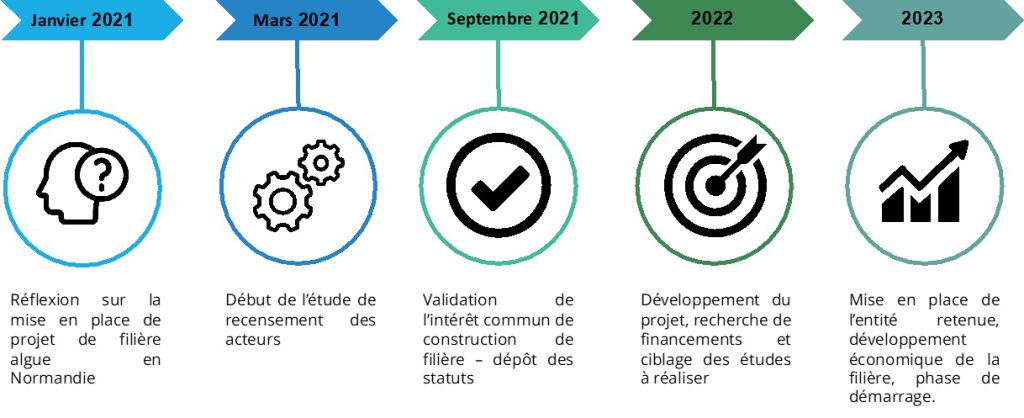Afin de construire cette filière avec un maximum de partenaires, une phase de rencontres et d’échanges était programmée entre Mars et Septembre 2021. Cette phase fut menée par une stagiaire en fin d’études au Master Management et Administration des Entreprises de l’IAE de Caen. Au cours de ces 6 mois, une enquête a pu être menée vers 35 à 40 personnes venant d’univers différents mais ayant un intérêt potentiel pour la matière « algue », de l’amont à l’aval.