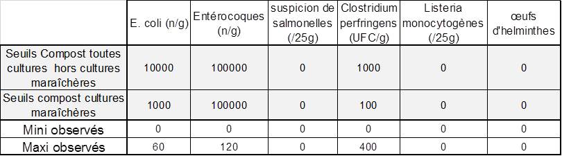Les concentrations observées sont inférieures aux seuils réglementaires prévus pour des applications en compostage, épandage ou remise à la mer. Un abattement significatif pour toutes les bactéries suivies, a été observé au bout de quelques semaines.