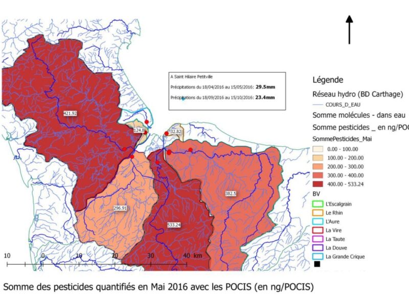 Cette étude a permis la hiérarchisation des flux pour les pesticides, les métaux et les HAP. Les flux sont liés à la fois au débit et aux concentrations mesurées dans les rivières, paramètres qui dépendent tous les deux des précipitations ayant eu lieu pendant et juste avant la période d’échantillonnage. Ainsi, la Vire et la Taute sont les deux plus gros contributeurs de la baie des Veys en particulier au printemps. Les écarts sont plus faibles en automne. A cette période, les autres cours d’eau peuvent également engendrer un flux de polluants significatifs.