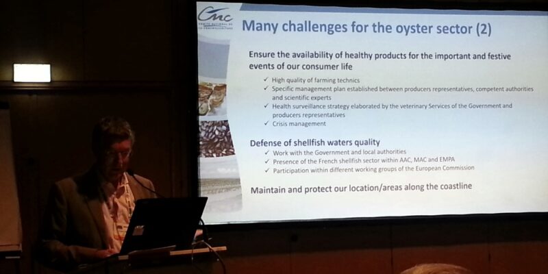 Introduit par le nouveau président du CNC, Philippe Le Gal, également président du CRC-Bretagne Sud, le premier thème abordé concernait l’état et l’avenir de la filière. L’occasion pour Thierry Hélie, nouveau président du CRC Normandie-Mer du Nord, de dresser un bilan de la richesse des terroirs conchylicoles français mais également de présenter les grands enjeux de la filière. Ces derniers, développés dans les séances suivantes, concernaient la qualité des coquillages et de l’environnement, avec des témoignages montrant toute l’importance de disposer d’outils d’observations efficaces mais également de moyens permettant d’être réactif. L’épilogue de cette journée traitait de la gestion des territoires conchylicoles. C’était l’occasion de découvrir quelques exemples d’outils d’aide à la décision et de mesurer quelle peut être l’ampleur des pressions qui pèsent sur le monde conchylicole.