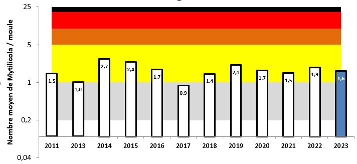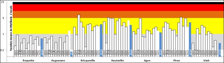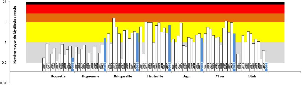 - Suivi de la présence de Mytilicola intestinalis: Depuis 2011, des évaluations du taux d’infestation sont réalisées chaque année afin de définir le niveau de risque de chaque secteur étudié. Pour plus de détails, télécharger le rapport “Etude et cartographie de Mytilicola intestinalis sur les côtes du département de la Manche (2010)”.