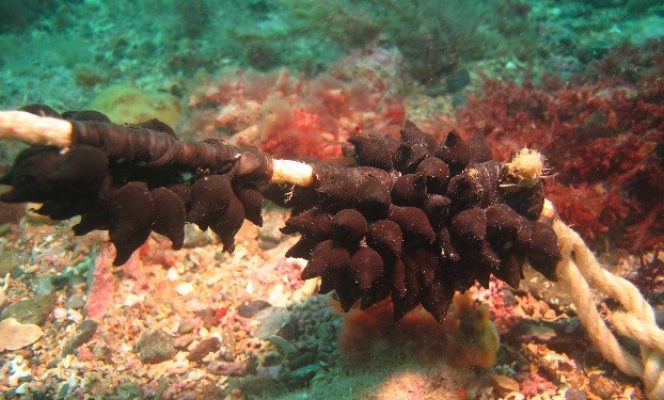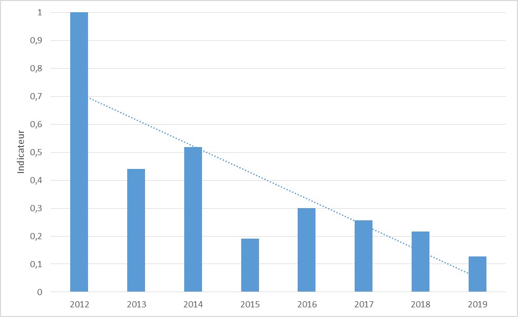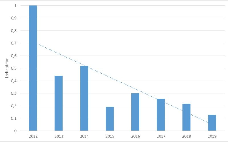 Comme indiqué dans l’article « Inquiétude sur la pêcherie de seiche normande » d’avril 2019, le SMEL réalise depuis 2012 un suivi des pontes de seiches sur les secteurs de la pointe d’Agon (Ouest du Cotentin, Manche) et de Luc sur mer (Calvados). Ce suivi est, d’une part basé sur la mise en place d’orins (30 par site) durant 3 mois (avril à juin) ainsi que sur 6 plongées dérivantes d’observation des pontes sur supports naturels. Un indicateur est calculé sur la base des données recueillies en 2012 (année de référence= 100%). En baisse depuis 2012, cette année montre un indicateur le plus bas depuis 8 ans et confirme la tendance. Cette baisse est autant marquée sur les orins (13 œufs/orin à Agon-Coutainville, 63 œufs/orin à Luc-sur-mer), que les sur supports naturels (7 œufs /1000 m²).