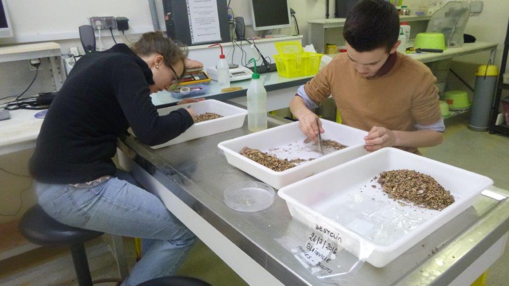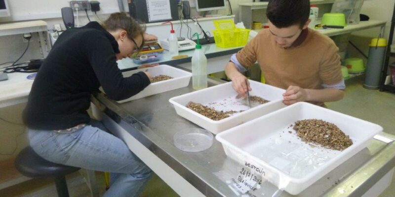 Des échantillons de buccins et de proies ont été prélevés sur deux sites différents au large de Blainville et de Chausey et à trois périodes de l’année (février, juin et octobre 2016). L’UMR BOREA a testé 3 techniques pour identifier les sources majeures d’alimentation du buccin : l’analyse directe au microscope