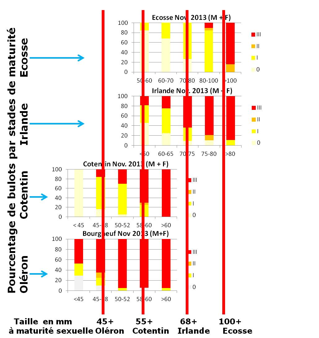 Sur le graphique « pourcentage de bulots par stade de maturité », il est possible de voir qu’à Oléron les bulots sont matures à partir de 45 mm, alors qu’ils ne le sont pas avant 55 mm dans le Cotentin, entre 65 et 70 mm en Irlande et au-delà de 100 mm en Écosse.