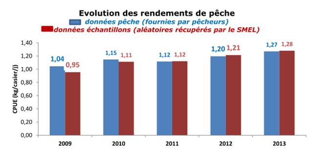 Sur la période 2009 – 2013 les rendements de pêche sont stables avec une moyenne d’1.14 kg de bulots par casier par jour (cf. graphique ci-dessous), signe d’une stabilité de la ressource pêchée.