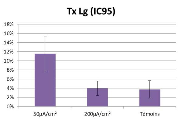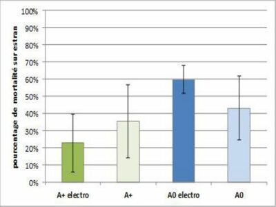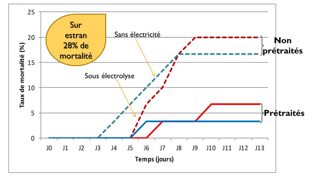 Forte de ces résultats positifs et afin de mieux calibrer la technique dans le cadre d’une application à plus grande échelle, une seconde série d’expérimentations a été menée en 2016. Ainsi, 2 000 individus (naissains de taille T6, nourris et non nourris) ont été mis sous électrolyse en milieu contrôlé pendant 11 semaines et comparés à 2 000 individus non traités.
