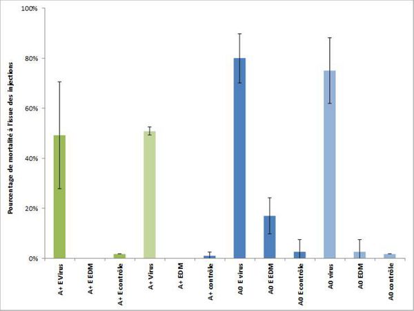 De plus, un essai préliminaire a été conduit pour tester la survie de ces animaux A+, ayant préalablement été soumis au traitement électrochimique, lors d’infestations expérimentales (injections du virus herpétique OsHV-1). Ces premiers résultats ont mis en évidence un meilleur taux de survie des individus pré-électrolysés par rapport à des témoins n’ayant pas subi le traitement électrochimique (graphique 3).