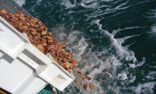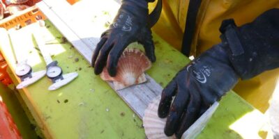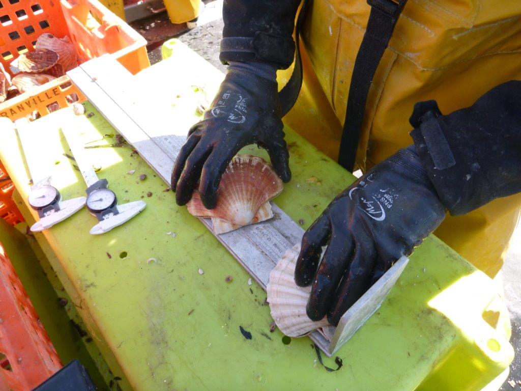 Le SMEL est partenaire scientifique et technique du projet depuis 2009. Chaque année, il participe à l’ensemencement du site et réalise 1 à 2 pêches expérimentales à bord de navires professionnels pour caractériser les captures en taille et en âge. En revenant sur les points d’ensemencement on peut suivre le semis identifiable par une marque de stress, évaluer les mortalités et déterminer un taux de recapture. On évalue à plus de 30% le taux de recapture des coquilles de semis dans la zone d’ensemencement. Il faudra attendre entre 2 et 3 ans pour pouvoir pêcher la coquille à sa taille commerciale (10,2 cm). Depuis 2013, le SMEL suit également les quantités débarquées sous la halle à marée de Granville et peut ainsi estimer la production générée par l’exploitation d’une vingtaine de navires. Sur la période 2013-2016, 140 tonnes / an environ de coquilles a été pêché par une flottille de 20 navires. C’est un produit de qualité dont le prix de vente est en constante augmentation depuis 2013 (+40%) comparé à la coquille pêchée dans le secteur de la Corbière de plus petite taille (+19%).