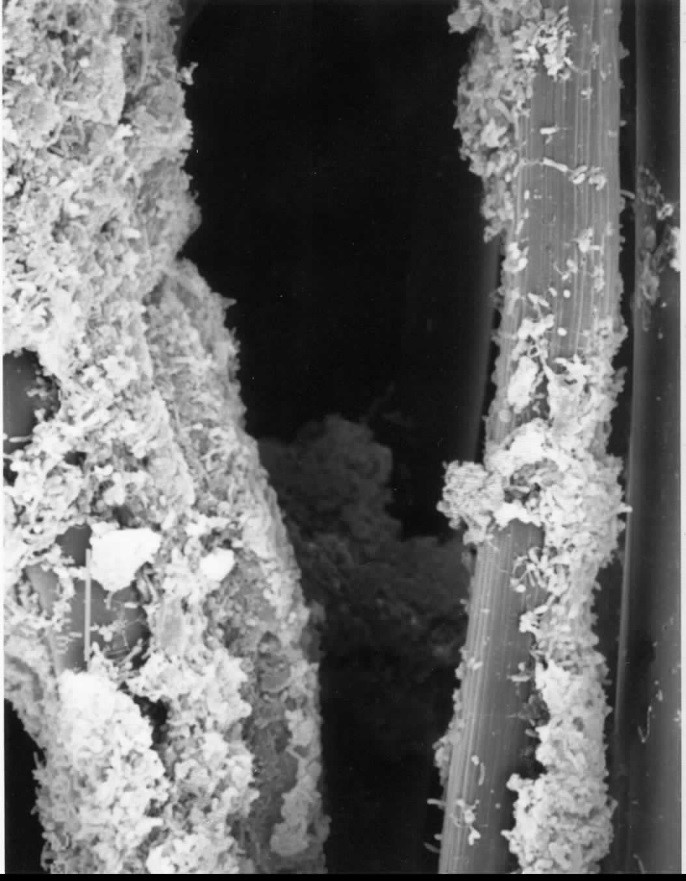 Préalablement aux essais d’épuration biologique, le potentiel de dégradation de la matière organique et du pigment (mélanine) par les 30 souches bactériennes présentes dans l’ELS a été évalué. Parmi ces souches, 17 montrent une bonne croissance aux diverses températures et salinités testées et une capacité à dégrader la matière organique. 7 sont capables de nitrifier et 7 sont capables de dénitrifier. Composé d’une sélection de 16 souches, un inoculum de 15 l a été utilisé pour ensemencer 2 réacteurs pilote à lit bactérien fixé, alimentés et aérés par le bas : l’un de 240 l rempli de biosphères, l’autre constitué de deux unités de 50 l contenant 11 biosphères chacune. Les bactéries ont colonisé les supports (photo 1) en 3 à 4 semaines de montée en charge et un bon potentiel de dégradation de la matière organique a été observé (rendement de 60% dès l’apport d’effluent).