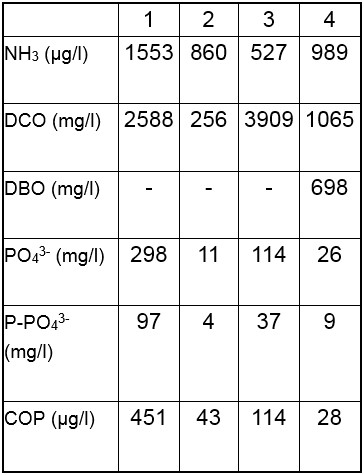 La caractérisation physico-chimique des effluents s’est portée sur les diverses étapes de traitement de l’eau de décorticage de coquillages (cuisson / séparation noix-coquille / retrait des impuretés / congélation) de l’eau de lavage de seiches (trempage ou décongélation (1) / éviscération (2) / enlèvement des dernières peaux(3) / rinçage final(4) (tab.1)) et de l’eau de cuisson de bulots (bain de cuisson). L’ECB s’est avérée la plus chargée en matière organique (MO) avec 40 g/l de DCO (Demande chimique en oxygène) contre 8.5 g/l pour l’ELS et 2 g/l pour l’EDC. Les trois effluents sont riches en protéines mais l’ECB est aussi riche en glucides. Les teneurs en ammonium, nitrite et nitrate sont faibles. La salinité est très variable: EDC≤ 5‰; ELS = 30‰ ; ECB ≤ 90‰. Les flux issus des différentes étapes de traitement ont été estimés.