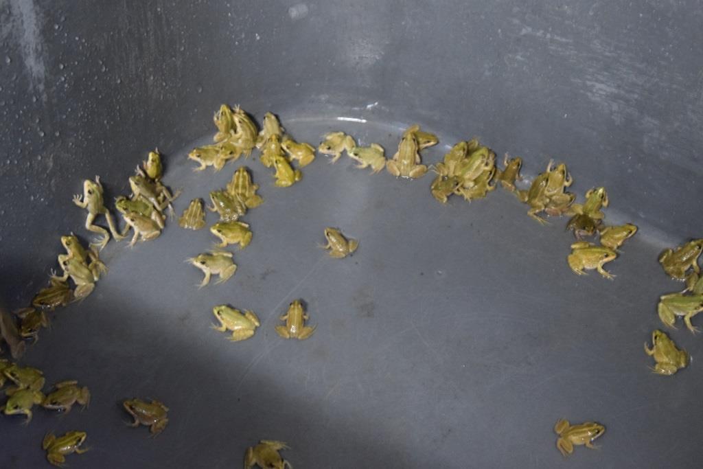 La première expérimentation a consisté à vérifier que le système d’élevage était satisfaisant et permettait aux grenouilles d’avoir une croissance significative et dans de bonnes conditions. Les toutes premières grenouillettes sont arrivées à Blainville sur mer en décembre 2016 en provenance de la ferme de Pierrelatte dans la Drôme. Avec un lot de 60 individus, les premiers essais ont permis de déterminer les durées d’expérimentation nécessaires à une croissance significative. Ce premier contact avec un matériel biologique inhabituel au SMEL, a permis de confirmer que les structures d’élevage mises en œuvre assuraient un bon environnement pour les grenouilles. Celles-ci se sont très vite adaptées, se sont nourries correctement et ont présenté un comportement normal. Cette première cohorte a permis de mesurer et d’estimer les variations de croissance entre des individus dominateurs qui grossissent vite et ceux qui, dominés, ont du mal à accéder à la nourriture. Ainsi, ces premières observations ont donné lieu à un essai d’isolement des animaux dits « queue de lot », qui grandissent pas ou peu. Isolés, ces animaux ont montré qu’ils pouvaient reprendre leur croissance sans pour autant rattraper le retard sur les dominateurs.