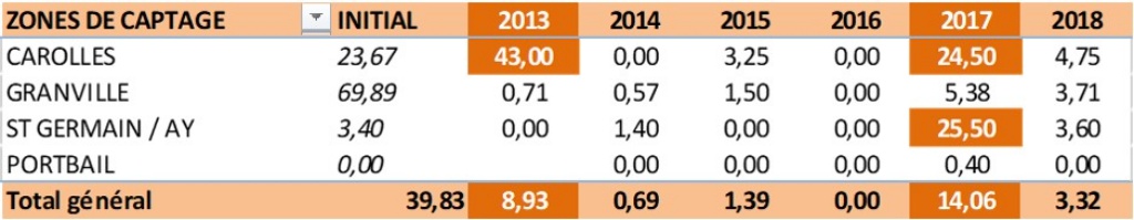 Pour l’année 2018, les résultats montrent que le recrutement est relativement faible sur l’ensemble des points de suivi mais homogène, hormis Portbail où le recrutement est inexistant. Ce résultat montre que l’année 2018 est insuffisante pour renouveler le stock d’huîtres sauvages.