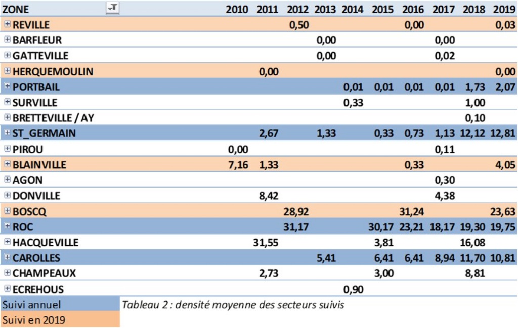 Le suivi de la colonisation confirme la stabilité des densités d’huîtres entre 2017 et 2018. On peut simplement noter une augmentation sur Blainville sur Mer (station suivie tous les 3 ans), probablement due à un recrutement important en 2017.