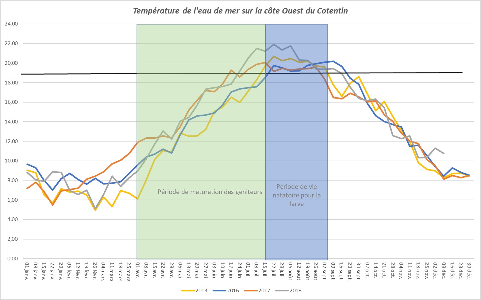 On peut donc voir une différence en termes de recrutement entre 2013 (recrutement très important sur Carolles), 2016 (année blanche), 2017 (recrutement important sur Carolles et St Germain sur Ay) et 2018 (recrutement faible). Il est donc intéressant de comparer la météo printanière, correspondant à la période de maturation des géniteurs, et estivale, correspondant à la période de vie larvaire nageuse, qui doit bénéficier d’une température supérieure à 19°C pour s’assurer d’une bonne survie.