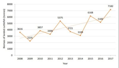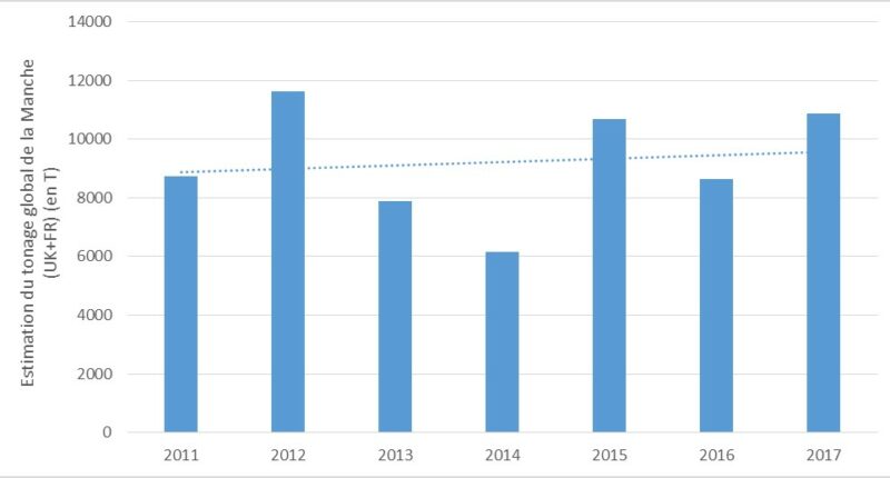 Le cycle de vie très court de la seiche (1 à 2 ans), lui confère un statut d’espèce opportuniste, ainsi les fluctuations du stock peuvent être importantes en fonction des conditions environnementales. Toutefois, Depuis 2011, les débarques globales (FR+UK) montrent une tendance plutôt stable (données FR non exhaustives). Il semblerait ainsi qu’il y ait un report des captures au profit des chalutiers hauturiers britanniques qui pêchent en Manche centrale au détriment de la pêche côtière (pêche au filet dans le Sussex, pêche au casier dans l’ouest Cotentin).