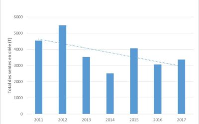 Le même constat a été fait sur l’activité des pêcheurs de seiche côtiers du côté français d’après les données de France Agrimer et du CRPMN. Les ventes de seiches sous criées de la façade Manche semblent montrer une forte tendance baissière depuis 2011 avec environ 1/3 de débarque en moins. Les halles à marée de Saint Quay et d’Erquy sont les principaux point de débarque français de la Manche avec environ 30% du total mis à terre. A Granville, la baisse est observée dans des proportions encore plus importantes (-50% environ). Elle concerne essentiellement la pêche côtière au chalut (98%) et la majorité des débarques est observée au printemps puis en automne.