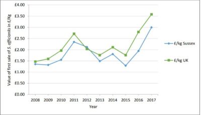 Une très forte augmentation des débarques en période hivernale des chaluts hauturiers britanniques exerçant leur activité en Manche centrale. La diminution des stocks de poissons en Manche semble avoir été le catalyseur de l’attractivité de la pêche de la seiche. Mais parallèlement, les prix à la débarque se sont envolés en 2018 et ont doublé sur les 10 dernières années (1.5 £/kg en 2008 contre 3£/kg en 2017) ce qui a pour effet d’amplifier l’intérêt pour cette espèce. Ainsi, l’augmentation de la valeur débarquée au Royaume-Uni pour la seiche est multiplié par 5 en moins de 10 ans (5.32 millions de £ en 2008 à 25.69 millions de £ en 2017). Cette activité de plus en plus lucrative engendre une augmentation du nombre de bateaux débarquant cette espèce (+16% sur 10 ans). Les chalutiers hauturiers débarquent en moyenne 45 t par bateau (en 2017) générant des revenus importants (135 000£/bateau).