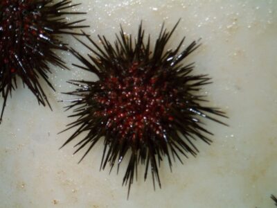 Bien connu par des amateurs de produits de la mer pour son goût iodé caractéristique, l’oursin est également utilisé pour tester la qualité des eaux (bioindicateur) ainsi que pour évaluer la toxicité de diverses molécules en laboratoire (écotoxicologie). Cependant, pour pratiquer cette méthode il est nécessaire de disposer d’oursins matures. Depuis plusieurs années, le SMEL maîtrise la technique d’élevage et de conditionnement permettant la production de géniteurs de bonne qualité et d’origine connue. Cette technique nécessite des infrastructures d’élevage conséquentes : eau de mer de qualité, structures en conditions contrôlées (température, photopériode, alimentation) et une maintenance aquacole 365 jours par an. Cette production unique en France obtenue au sein du centre expérimental du SMEL est difficilement réalisable pour les laboratoires qui utilisent la larve d’oursin.