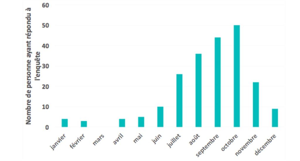 La pêche au bouquet de loisir se pratique en général à l’aide d’une épuisette, pendant les grandes marées, au niveau de crevasses rocheuses. Un questionnaire a été mis en place afin de mieux caractériser l’effort de pêche produit par les pêcheurs amateurs. 51 personnes y ont répondu entre octobre 2020 et janvier 2021, permettant de visualiser la période de pêche la plus intense (figure 5) et d’avoir des informations sur la connaissance de la législation par les amateurs (figure 6) et leur sensibilité par rapport à l’état de la ressource (figure 7).