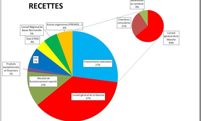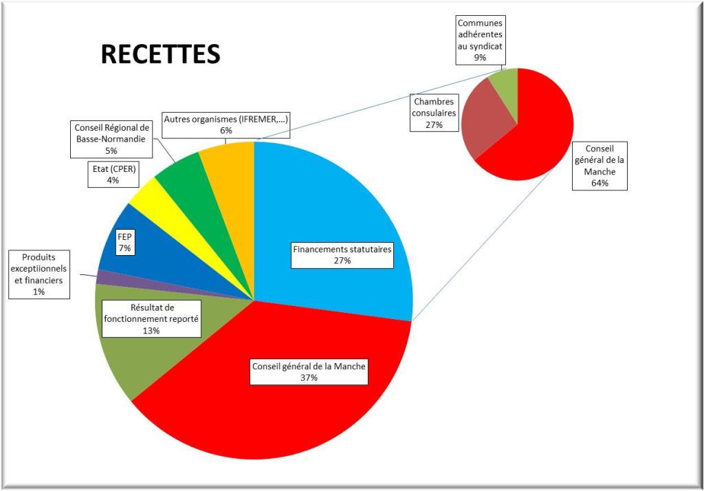 Des financements fléchés : Le résultat du fonctionnement reporté et des financements ciblés sur des opérations apportent le complément financier soit 689 823 Euros. Parmi les financeurs fléchés sur les opérations, le Conseil Général de la Manche représente la plus grosse part avec 37% des recettes budgétaires. Viennent ensuite le FEP, les agences de l’Etat et le Conseil Régional de Basse-Normandie.
