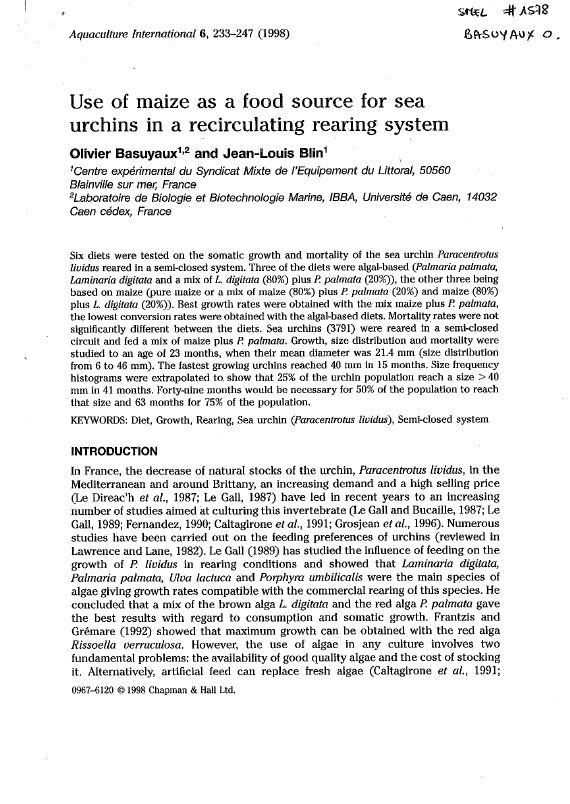 Parmi les espèces à haute valeur ajoutée, l’oursin violet Paracentrotus lividus, que l’on trouve sur les côtes méditerranéennes et bretonnes, présente des atouts aquacoles intéressants. Après de nombreuses années d’études, le SMEL maîtrise l’élevage de cette espèce en circuit semi-fermé. Toutefois, la rentabilité d’un tel investissement n’est pas assurée. Cependant, l’élevage garde un intérêt pour différentes applications comme le maintien de géniteurs a but de recherche en interne comme vers d’autres équipes et pédagogique, notamment vers les collèges et lycées. L’alimentation dans un élevage en conditions contrôlées reste le facteur limitant. Cette étude montre qu’une alimentation conjuguée algue – maïs permet d’augmenter la capacité de l’élevage d’oursins tout en limitant la pression sur les stocks naturels d’algues.