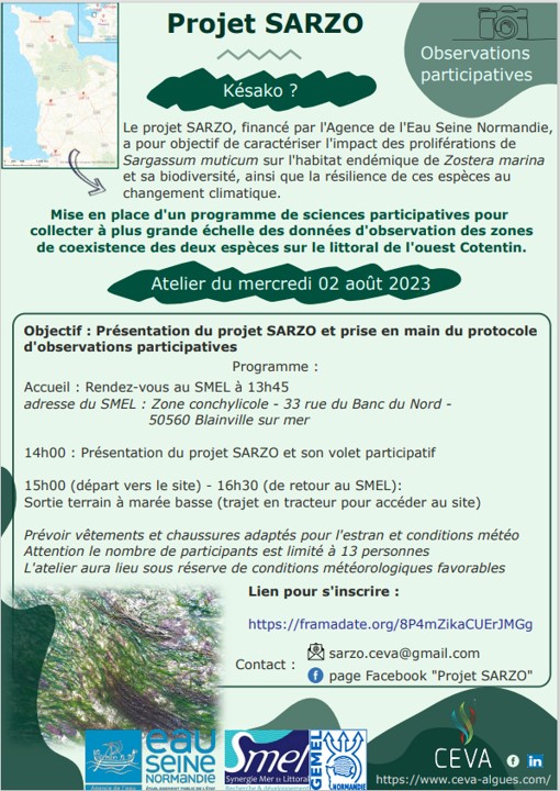 Dans le cadre du projet SARZO, un atelier est organisé le mercredi 02 août 2023 afin de présenter dans un premier temps le projet (au sein des locaux du SMEL à Blainville sur mer) et dans un second temps de prendre en main le protocole d’observations participatives au cours d’une sortie terrain sur l’estran à marée basse.