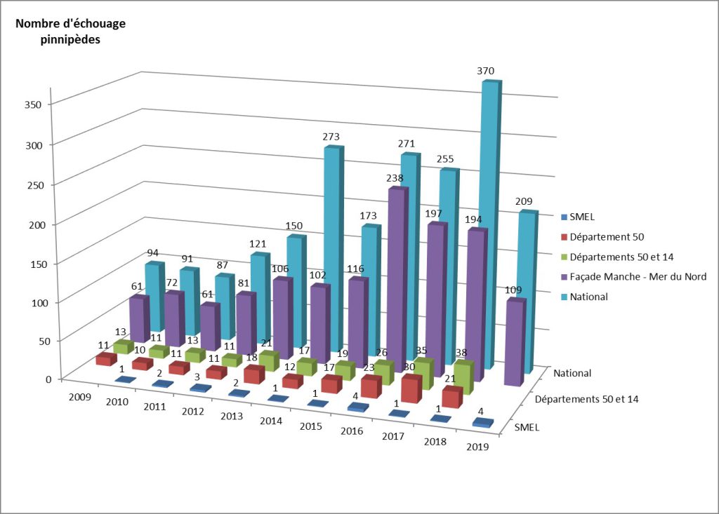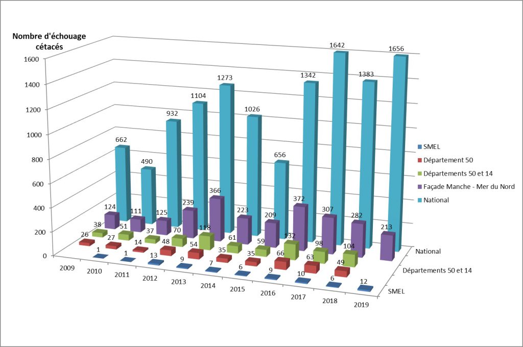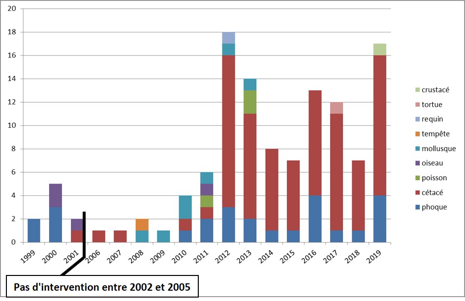 Si certains échouages sont parfois surprenants comme un requin, une tortue, ceux de poissons, crustacés, oiseaux et mollusques (coquilles St Jacques) sont plus communs. D’autres types d’échouage sont présents et assez fréquents, comme ceux des mammifère marins.  Ces derniers sont suivis par le réseau national PELAGIS, basé à La Rochelle et dont le SMEL fait partie. A partir de 2012, l’implication du SMEL dans le réseau national d’échouage (RNE) est plus régulière et constante. Le graphique ci-dessous représente l’ensemble des échouages pour lesquels les agents du SMEL sont intervenus.