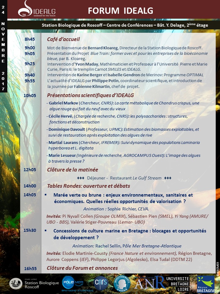 Le projet IDEALG est un projet d’investissement d’avenir, financement gouvernemental, ayant pour objet le développement des biotechnologies auprès de la filière des macro-algues. Ce projet réunit 18 partenaires scientifiques, techniques et industriels, pour la plupart breton, réunit autour Philippe POTIN, directeur de recherche au CNRS à la station biologique de Roscoff et coordinateur du projet.