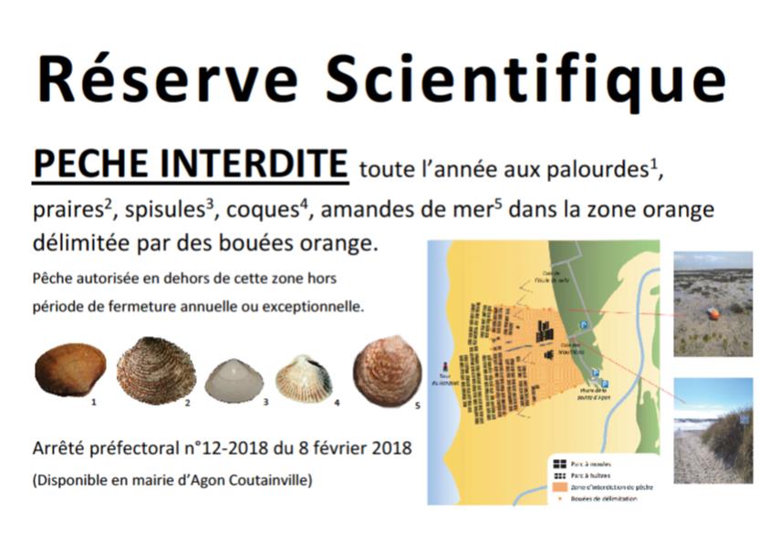 L’arrêté n° 12-2018 a instauré la création d’une réserve temporaire pour l’étude des bivalves fouisseurs dans le secteur de la Pointe d’Agon (Agon-Coutainville, Manche). L’objectif est de suivre l’évolution des communautés de macrofaune benthique, du peuplement de bivalves et de la population de palourdes en comparaison avec des sites pêchés (Blainville-sur-mer & Annoville / Lingreville). Il est prévu une fermeture totale de la réserve scientifique de 2018 à 2020, puis une réouverture partielle en 2021 et une ouverture complète en 2022. Cette réserve est balisée par 20 bouées de couleur orange situées sur le pourtour. Des panneaux d’information ont été placés à la cale de l’école de voile d’Agon-Coutainville, les parkings de la pointe d’Agon et à la cale des moulières.