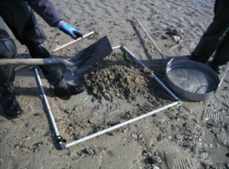 Afin de suivre la reconstitution des stocks, 3 campagnes de prélèvement par an durant les 5 années sont effectuées sur 4 zones : Blainville-sur-mer (Zone A), la partie nord de la réserve d’Agon-Coutainville (Zone B), la partie sud de la réserve (Zone C), et Lingreville (Zone D). Sur chaque zone, le sédiment de 12 stations de 1 m² est prélevé puis tamisé sur place (vide de maille 5 mm). Les bivalves sont identifiés, mesurés et pesés individuellement au laboratoire du SMEL avant d’être relâchés sur la zone. Le suivi de la faune benthique et la granulométrie sont réalisés une fois par an en hiver sur 9 points d’échantillonnage par zone (soit 36 points par an) à l’aide d’un carottier à main de 20 cm de diamètre et 20 cm de profondeur. Pour la faune, la fraction fine est éliminée à l’aide d’un tamis de maille 1 mm puis le refus de tamis est stocké dans un contenant étanche. Après fixation, les échantillons sont rincés à l’eau et les individus sont triés des sédiments puis conservés dans de l’alcool à 70°. Chaque individu est identifié et dénombré sous loupe binoculaire et microscope (dans le laboratoire du GEMEL-N à Luc-sur-mer). L’identification des individus observés est faite à l’aide de clés d’identification morpho-anatomique (WoRMS).