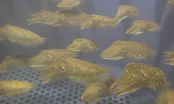 Après trois mois d’élevage, quelques centaines de seiches ont atteint une taille moyenne de 11 g dans la première claire, quelques individus pesant plus de 60 grammes. Ces premiers résultats sont très encourageants car de nombreuses optimisations telles que la limitation de la prédation par les oiseaux grâce à des filets…, l’augmentation de la température de l’eau par la pose de bâches, ou encore l’apport d’une alimentation mieux acceptée par les seiches sont possibles.