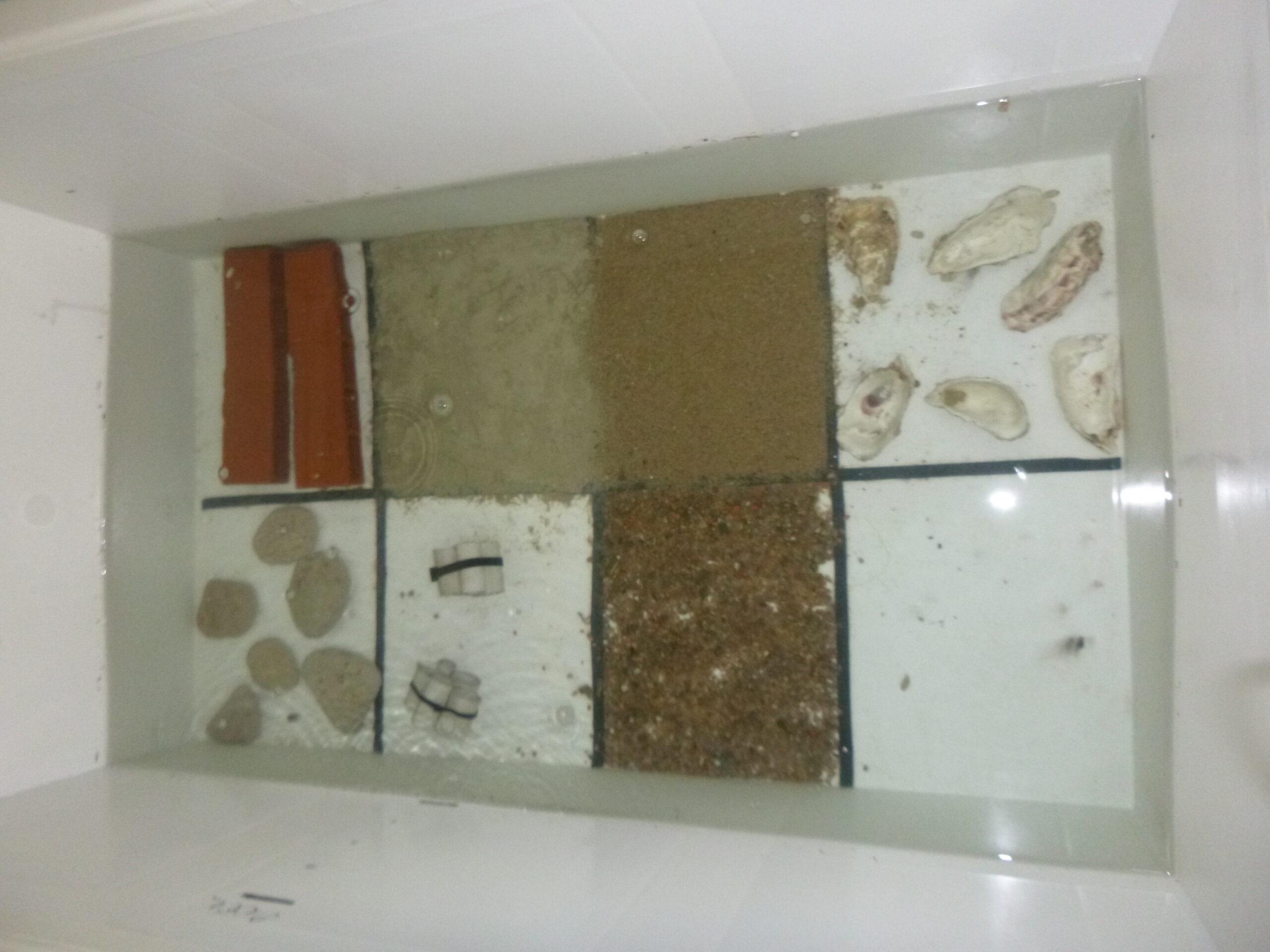 Des casiers dotés de nombreux œufs de seiches, fixés sur leurs mailles, ont été placés dans des claires ostréicoles de la Cabanor à Blainville sur mer (département de la Manche) au mois de juin 2015. L’éclosion massive des œufs a eu lieu au début du mois de juillet. Deux claires ont ainsi été ensemencées avec plusieurs milliers d’œufs ; la première disposait d’un aérateur et d’une alimentation régulière en granulés pour poissons ; l’autre n’était ni équipée, ni alimentée.
