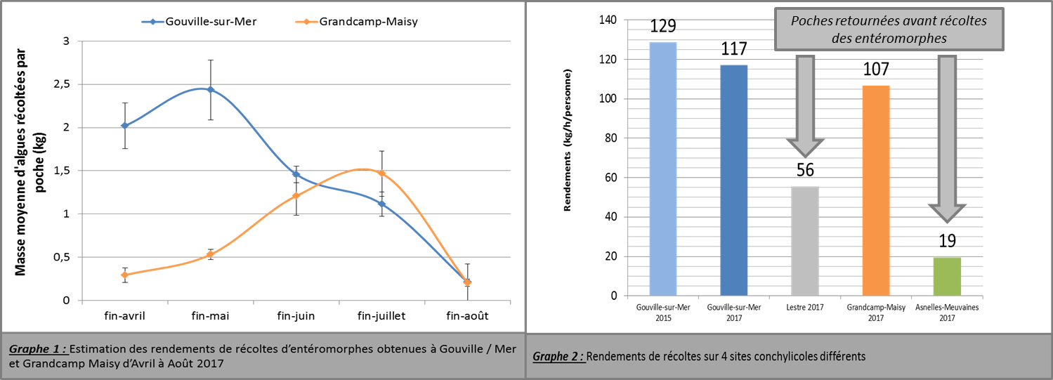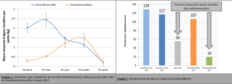 L’étude sur les concessions ostréicoles normandes durant le printemps et l’été 2017, par le stage de M2 de l’Universite de Caen de Solène Eustache, montre des résultats qui, souvent, confirment les chiffres obtenus les années précédentes et approfondit la réflexion sur l’intérêt de la récolte. La plupart de ces résultats ont été obtenus sur 2 sites très différents, Gouville-sur-Mer (Manche), bassin en mer ouverte et Grandcamp-Maisy (Calvados), au cœur de la baie des Veys et qui est aussi un estuaire de 4 petits fleuves côtiers.