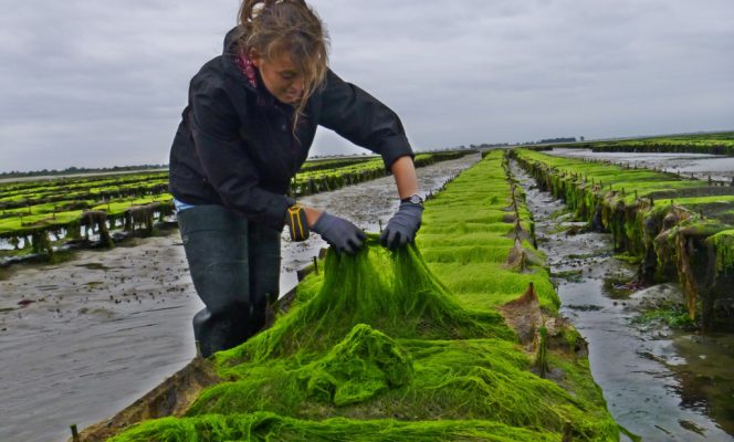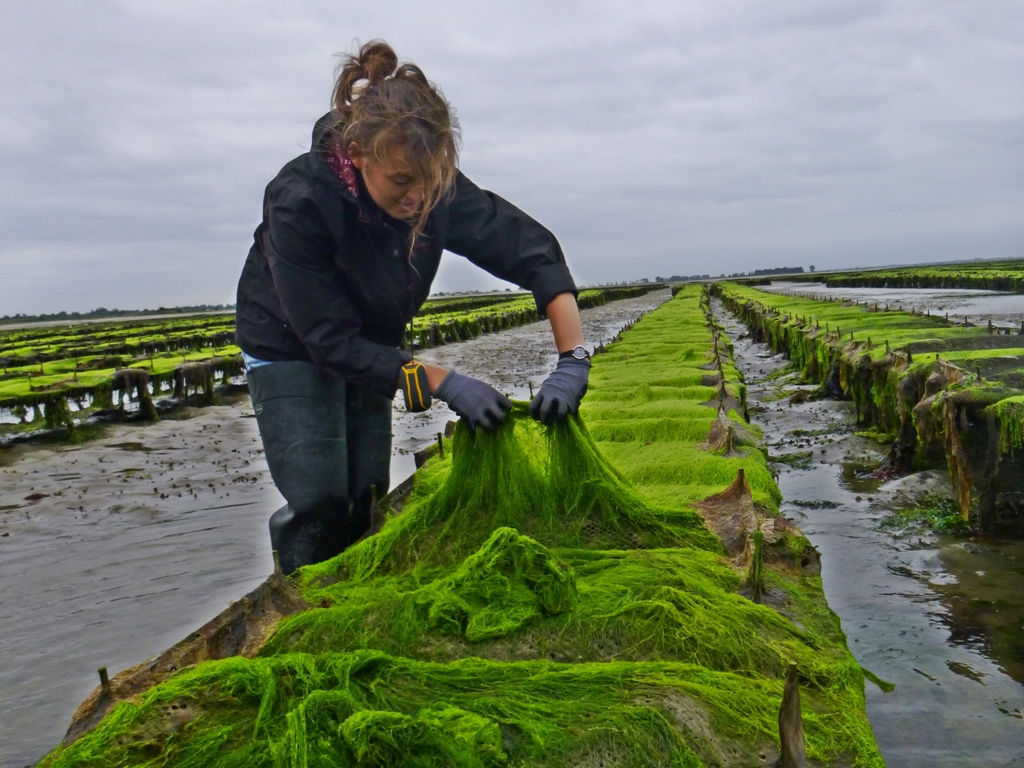 Après les premiers essais effectués entre 2013 et 2015, certains ostréiculteurs ont souhaité que se poursuive l’étude autour de l’exploitation des entéromorphes (Ulva sp.) présentes sur les poches d’élevage ostréicole. Pour cela, le partenariat s’est étoffé autour du SMEL et du Comité Régional de la Conchyliculture Normandie Mer du Nord (CRC NMdN) avec l’arrivée dans ce projet de la société ALGAIA et d’ACTALIA. Désormais financée par la région Normandie jusqu’à l’automne 2018, la recherche s’oriente vers une exploitation et une valorisation à l’échelle régionale de cette algue. Les premiers résultats obtenus sur le terrain permettent déjà d’avoir un aperçu de l’état de la ressource et de ses possibilités d’exploitation.