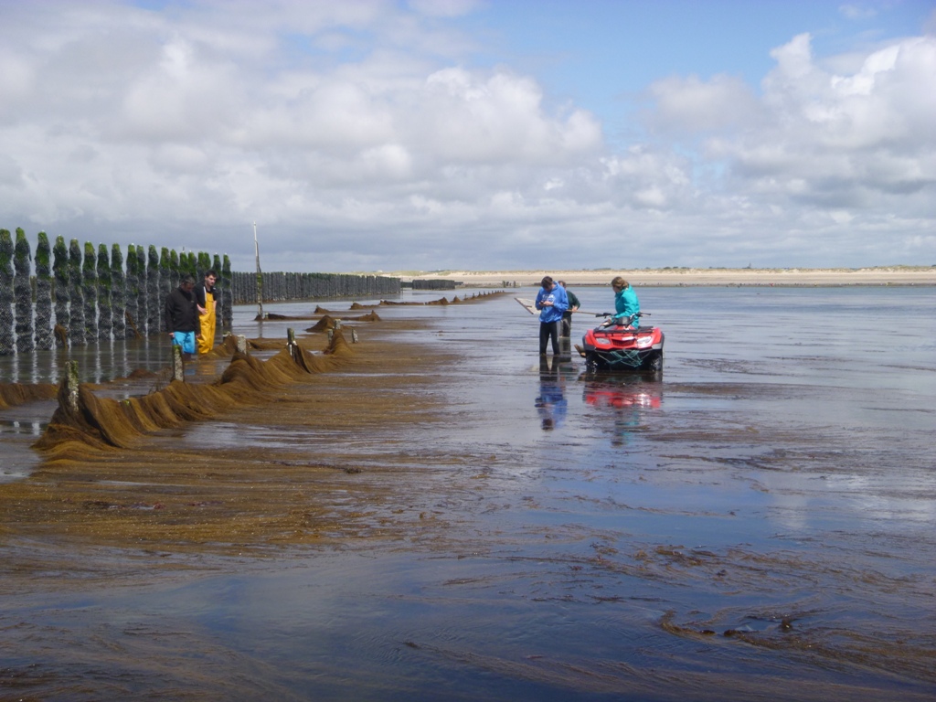 Le stock de sargasses est exploitable selon deux sources. La première est l’exploitation des barrages qui sont destinés à protéger l’élevage mytilicole. Le but est à la fois de déterminer la structure du barrage, sa disposition et son potentiel de capture. Après deux années de tests sur le terrain, il apparait qu’un barrage composé d’une simple corde située à 30 cm du sol entre deux poteaux espacés de 2 mètres a des résultats comparables aux autres structures testées. Celle-ci offre l’avantage de ne pas empêcher outre mesure la libre circulation sur le Domaine Public Maritime. Et le pouvoir de captage de ce barrage est d’environ 90 kgs par mètre linéaire et par an. Dans une configuration de protection du parc de Bricqueville sur Mer, 2 kms de barrages semblent être un minimum, ce qui correspondrait à une récolte totale de 220 tonnes par an.