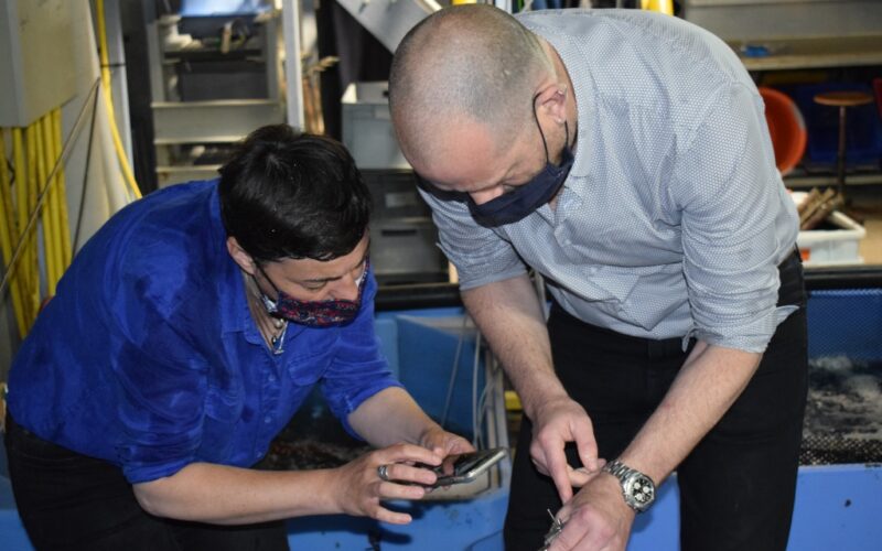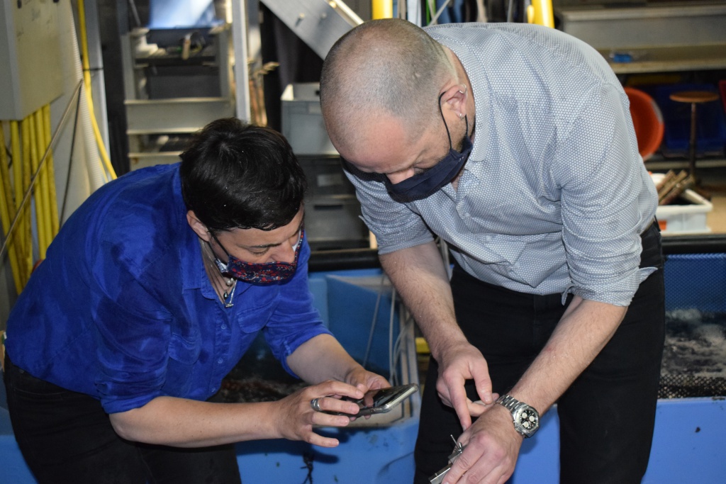 Isabelle Rouget et Antony Herrel, deux chercheurs du Muséum National d’Histoire Naturelle étudient la force de morsure des céphalopodes. Habitués à travailler sur différentes espèces fossilisées ou vivantes, ils étudient leur morphologie et l’anatomie musculaire afin de modéliser le fonctionnement des mâchoires. Le samedi 5 juin 2021, ils sont venus au Centre expérimental du SMEL pour valider leur modélisation sur des seiches bien vivantes, une première mondiale !!! Cette étude devrait se poursuivre avec des essais sur le calmar et le poulpe. Le SMEL étant habilité à abriter des céphalopodes, la mise à disposition d’animaux vivants d’excellentes qualités ainsi que de l’infrastructure du centre expérimental leur a permis de faire une belle avancée dans la recherche. Ces premiers essais préfigurent sans doute le début d’une collaboration avec de nombreuses perspectives.