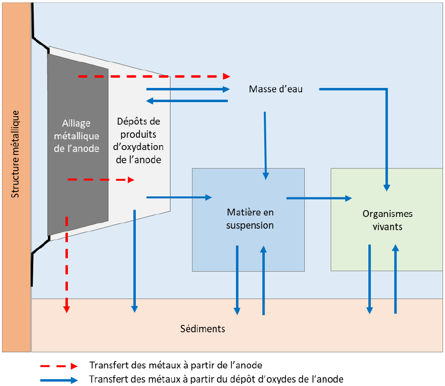 D’un point de vue empirique, la masse d’alliage métallique issue des anodes galvaniques représente un transfert massique négligeable dans l’environnement marin au regard de la durée de dissolution (au moins 15 ans) et des masses d’eau concernées (et renouvelées).