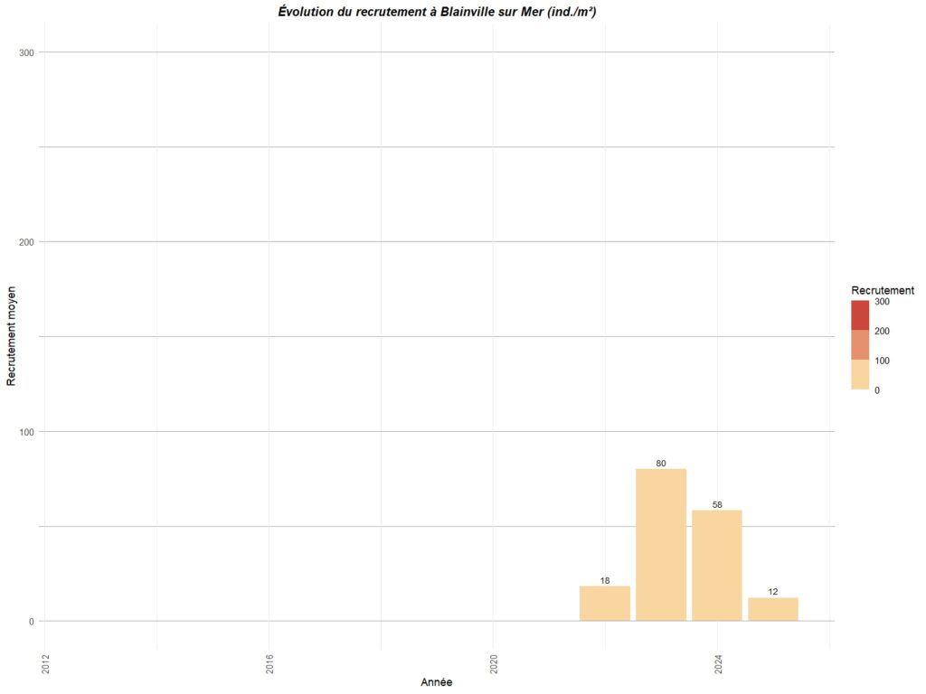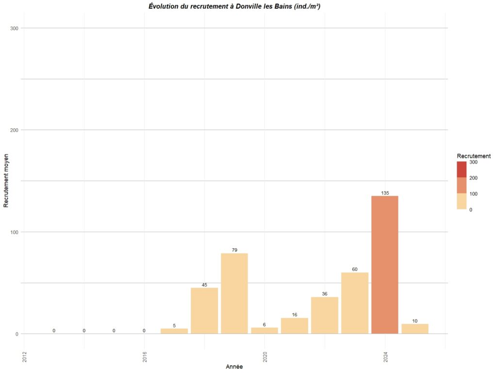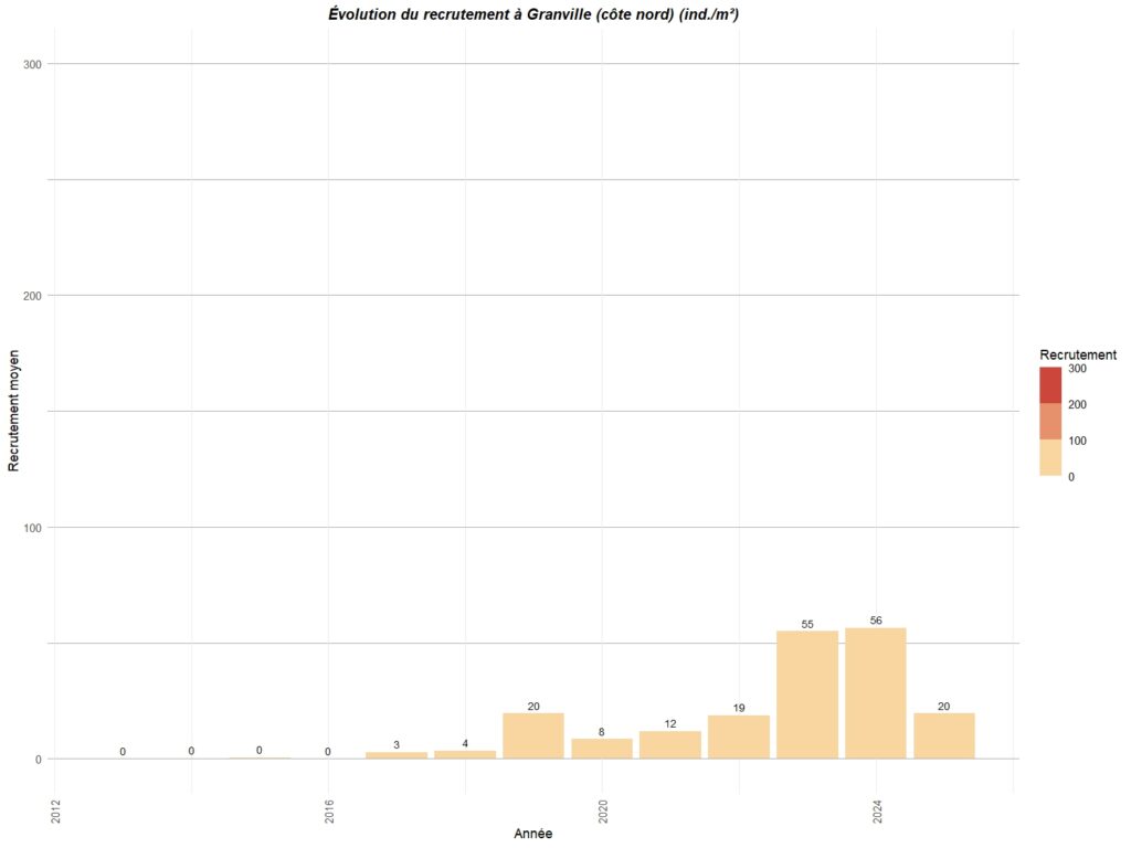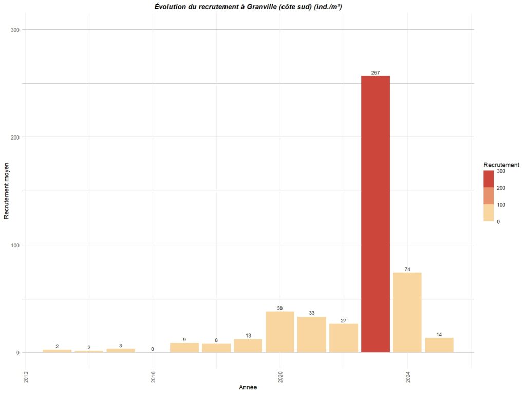 Le graphique ci-dessous résume le recrutement observé sur différents points de la côte ouest du Cotentin entre Carolles au sud et Portbail au nord.