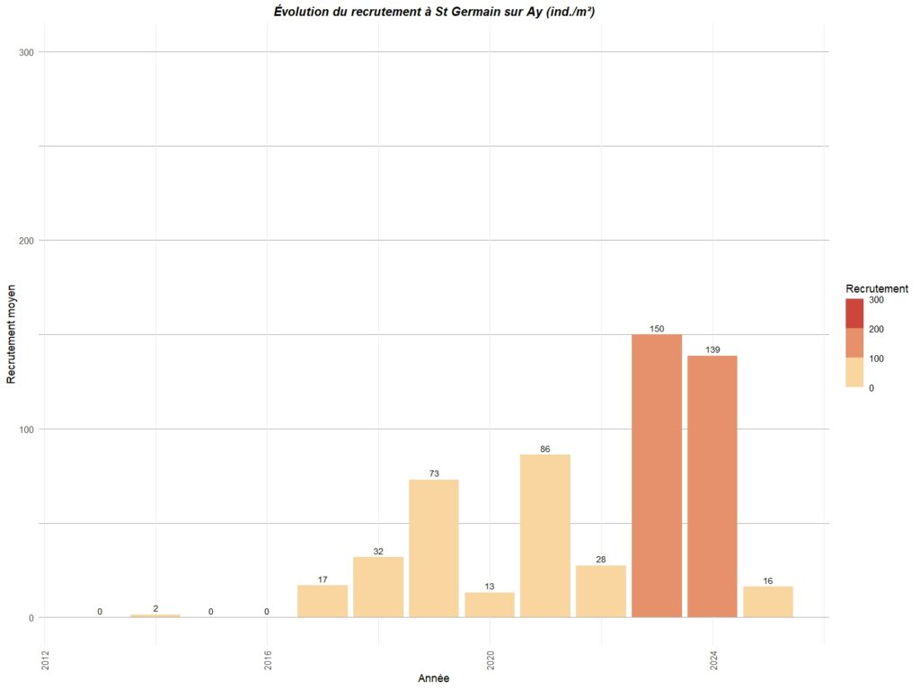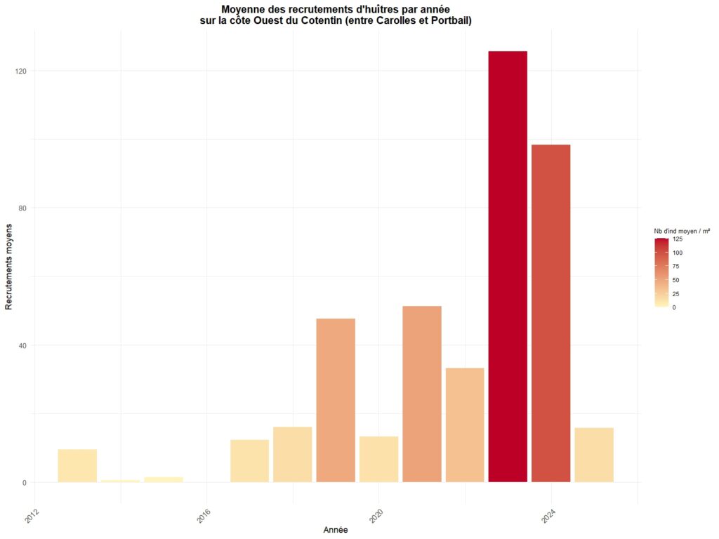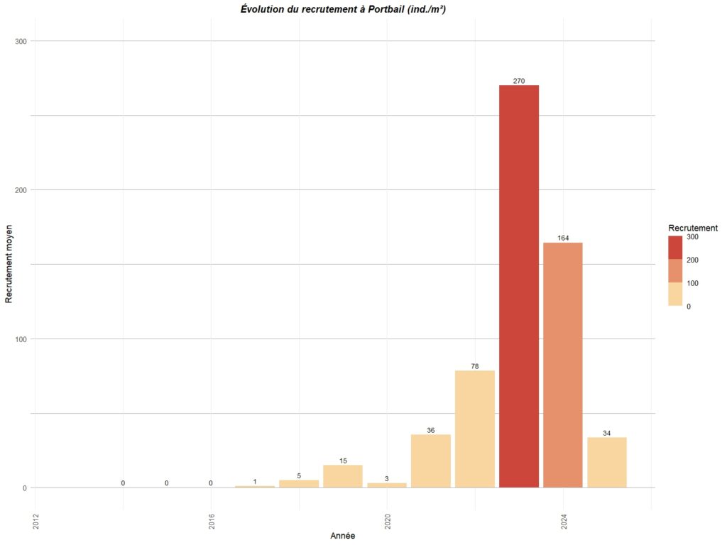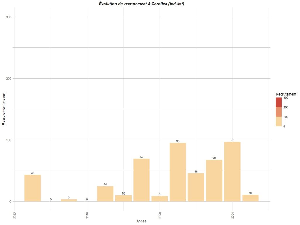 Le graphique ci-dessous résume le recrutement observé sur différents points de la côte ouest du Cotentin entre Carolles au sud et Portbail au nord.