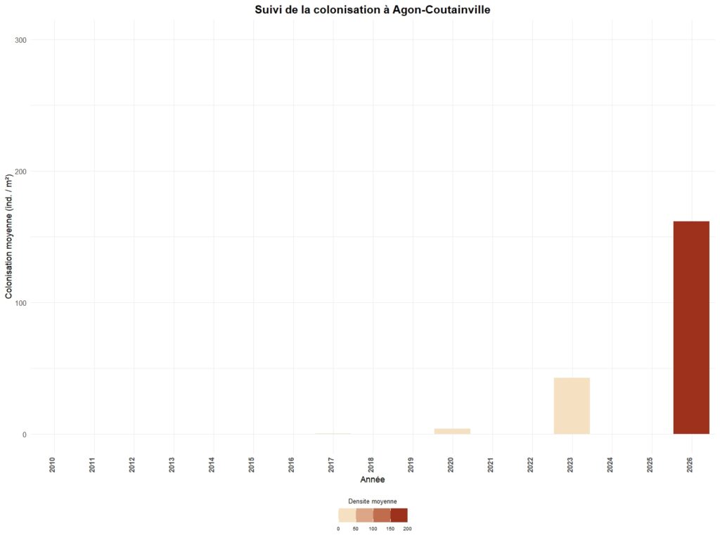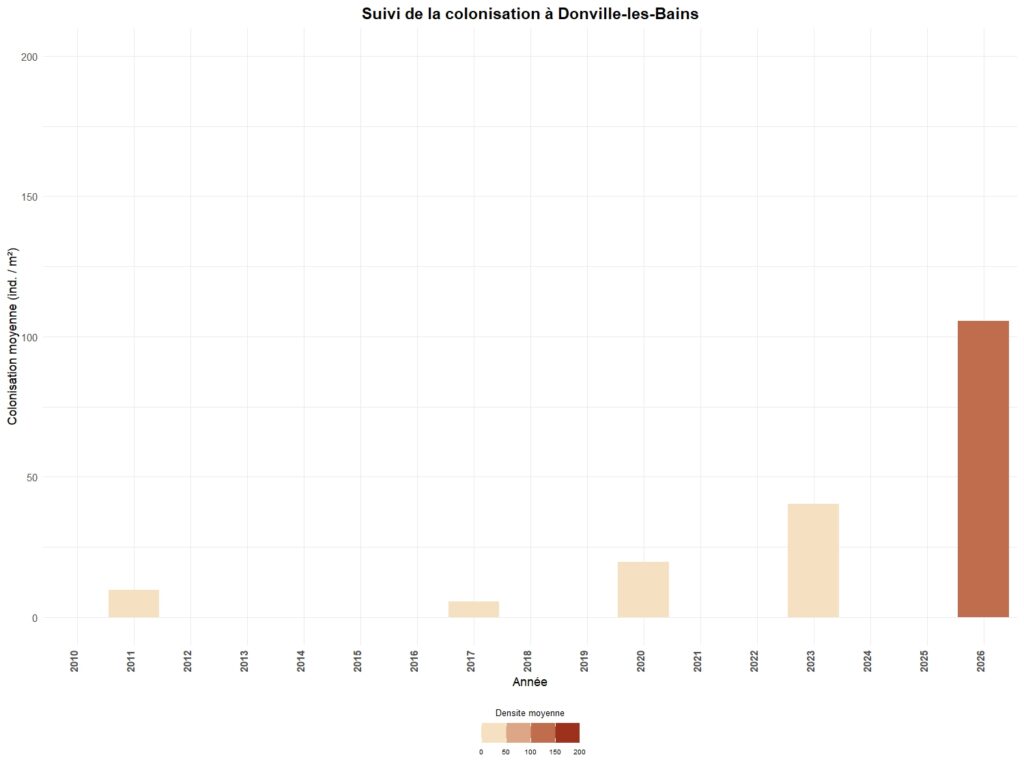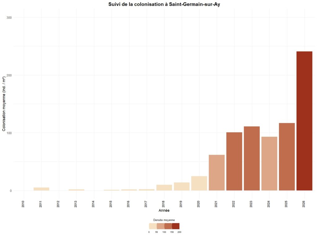 La colonisation est généralement suivi tous les trois ans sur chaque secteur, à l’exception de 5 sites suivis annuellement.