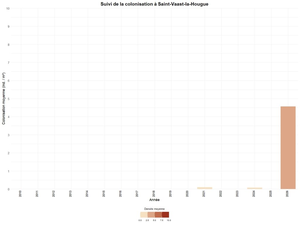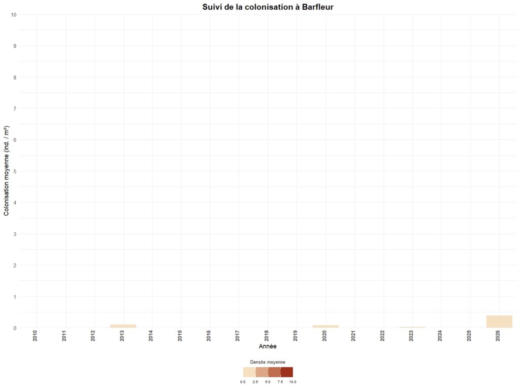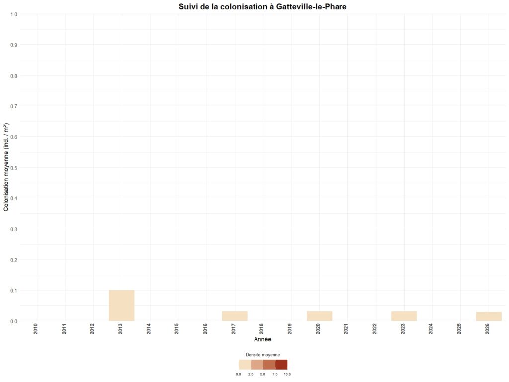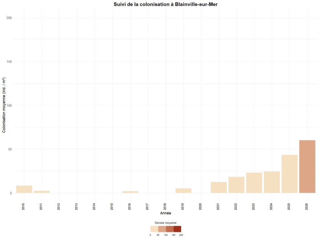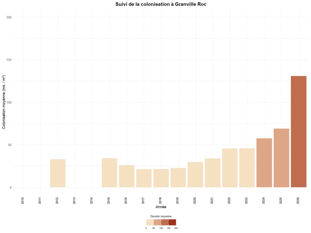 - Par un suivi de la colonisation par une méthode de cadrats sur un certain nombre de secteurs. Ce suivi peut être annuel (Carolles, Granville-le-Roc, Blainville-sur-Mer, Saint-Germain-sur-Ay & Portbail) ou triennal pour l’ensemble des autres stations.