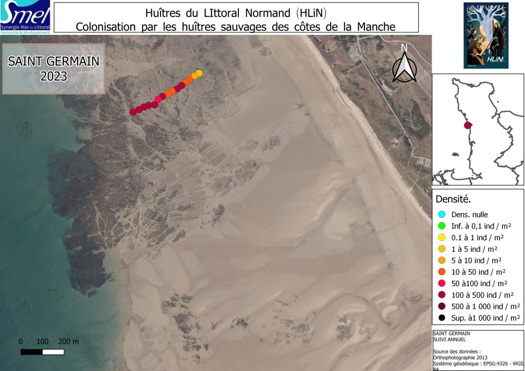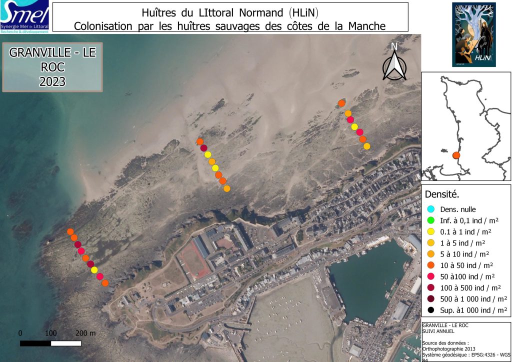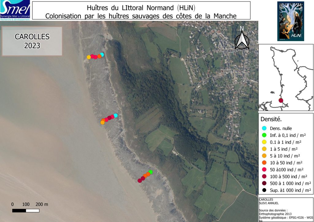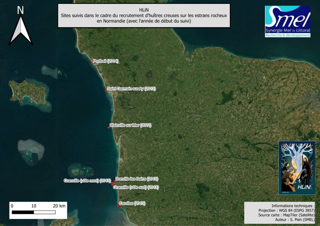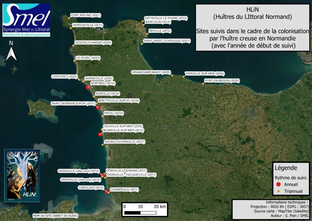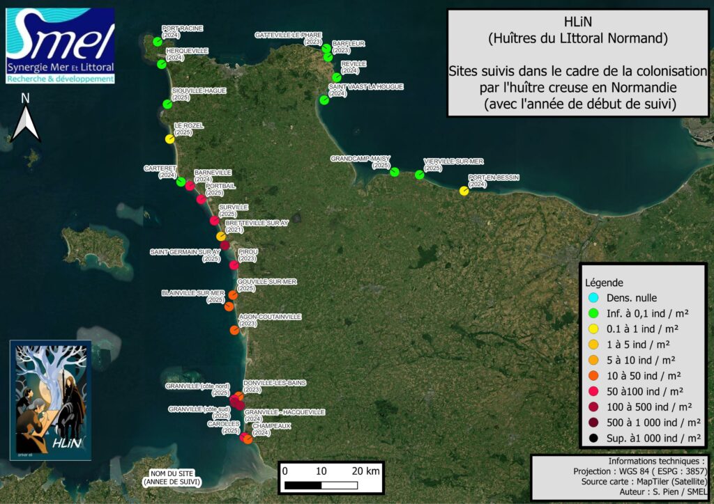 Depuis 2010, le SMEL suit la colonisation sur les côtes de la Manche par l’huître creuse Magallana gigas (Thunberg, 1793). Initialement présente sur les rochers de Carolles au sud à Saint-Germain-sur-Ay au nord, elle est aujourd’hui présente sur nombre des côtes rocheuses du littoral de Normandie.