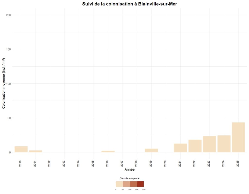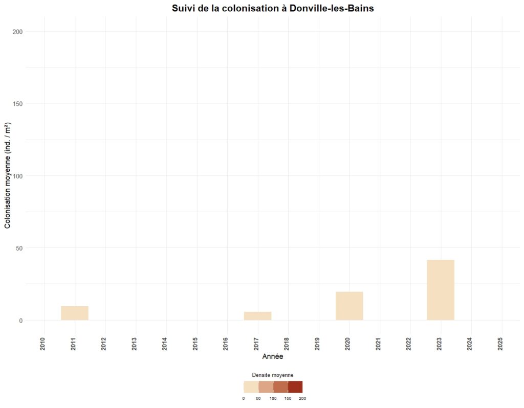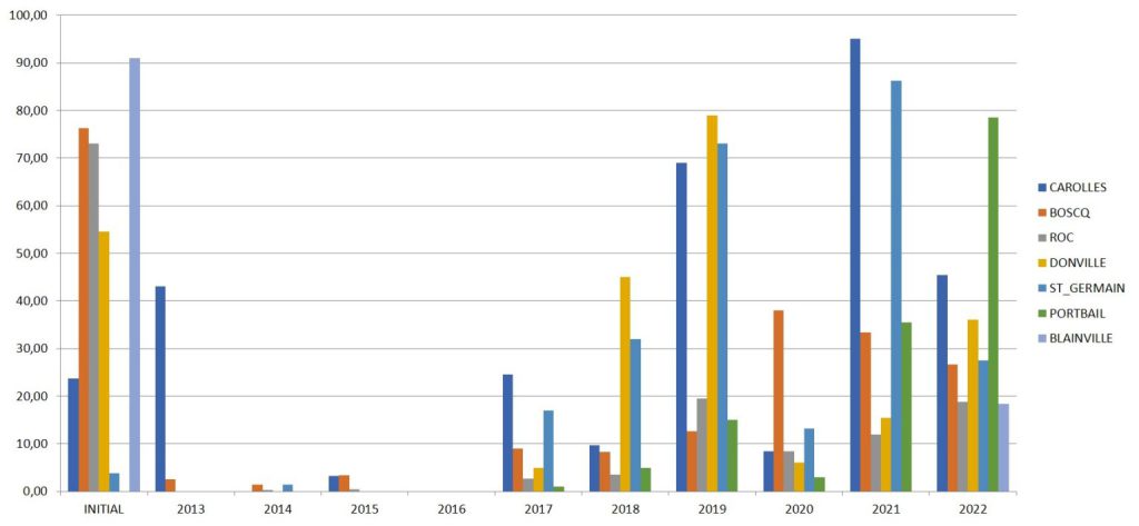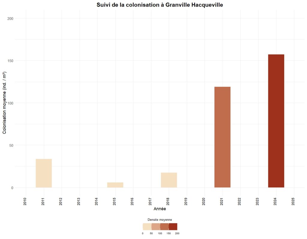 - Par un suivi de la colonisation par une méthode de cadrats sur un certain nombre de secteurs. Ce suivi peut être annuel (Carolles, Granville-le-Roc, Blainville-sur-Mer, Saint-Germain-sur-Ay & Portbail) ou triennal pour l’ensemble des autres stations.
