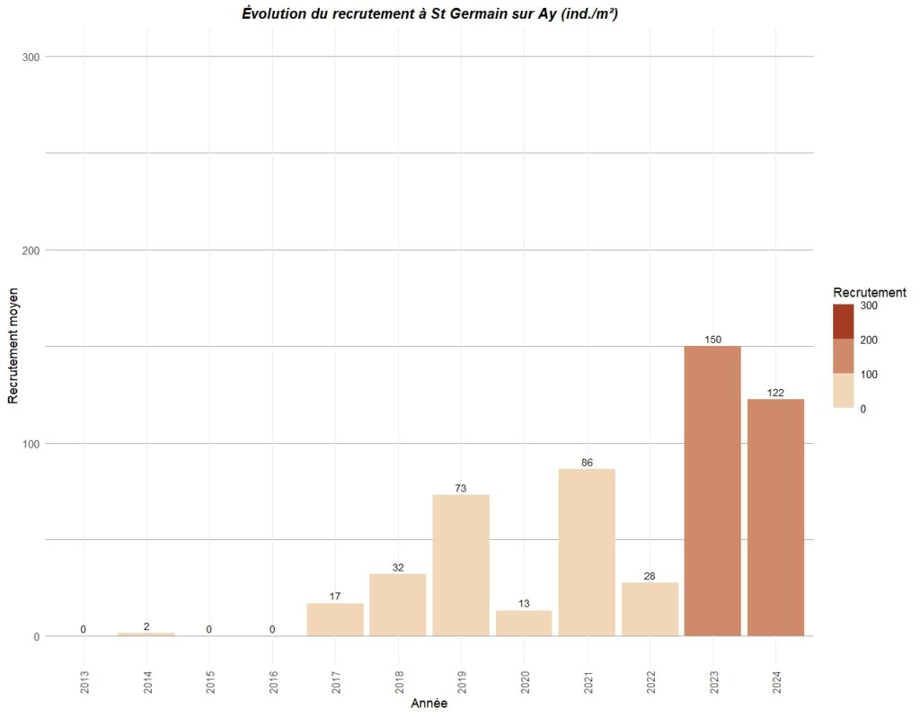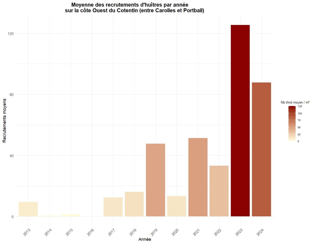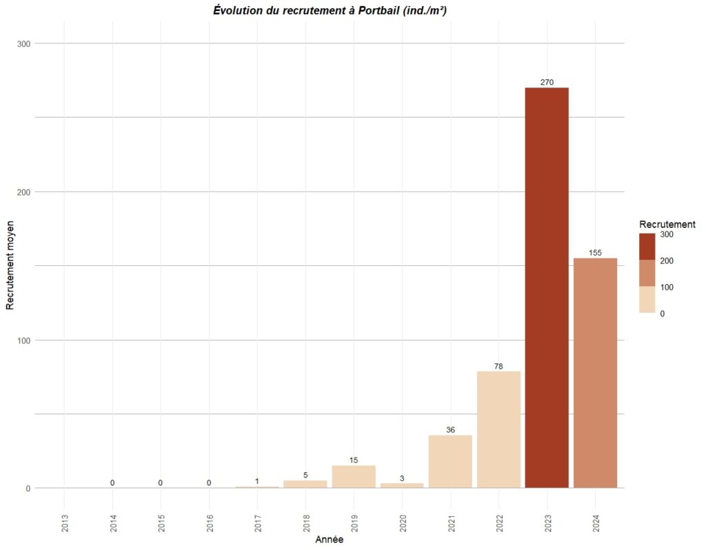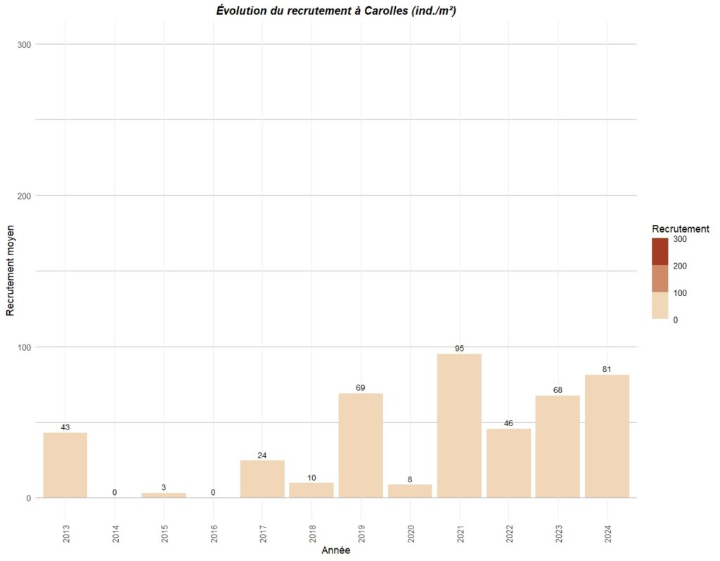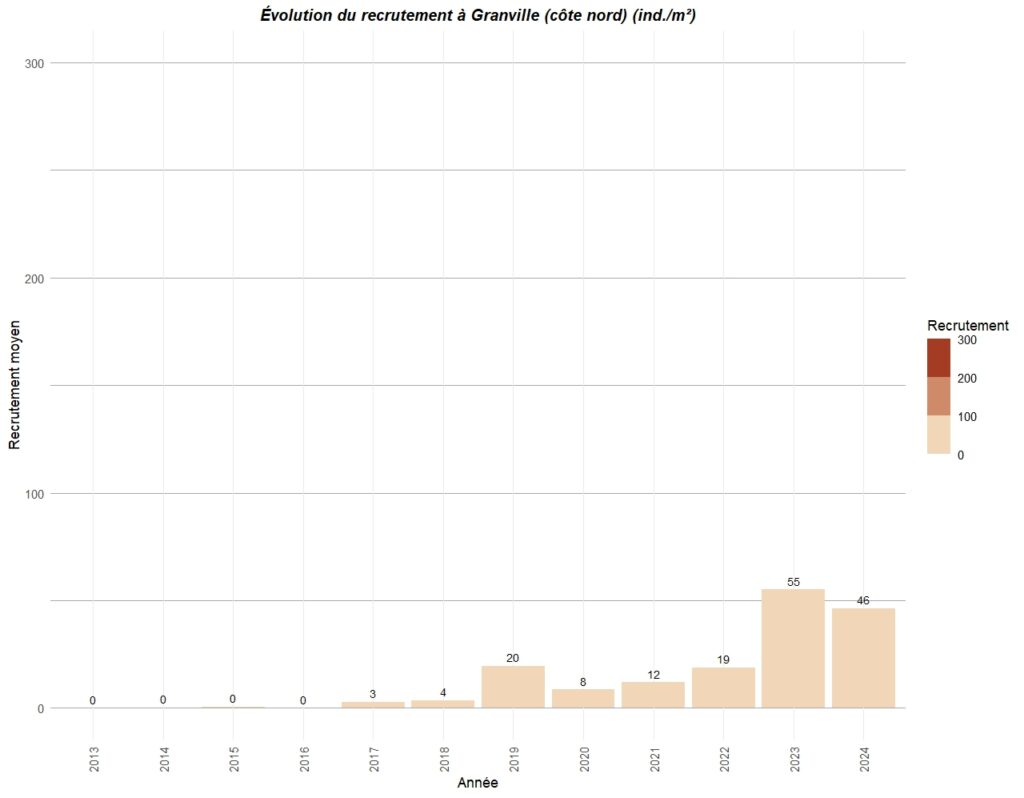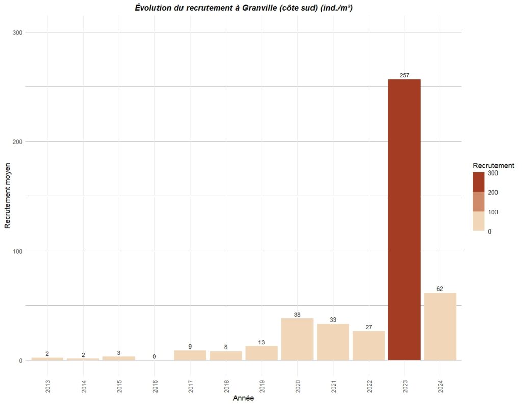Le graphique ci-dessous résume le recrutement observé sur différents points de la côte ouest du Cotentin entre Carolles au sud et Portbail au nord.