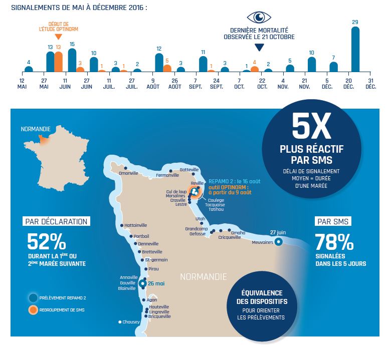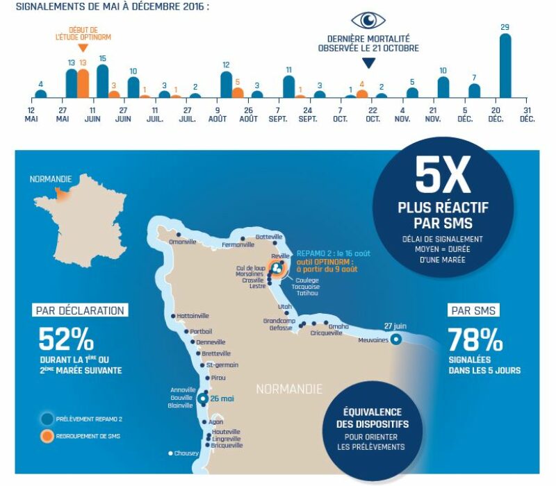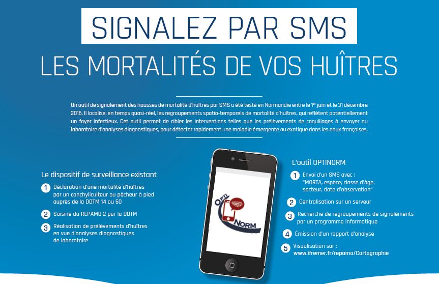 Dans le cadre d’une mission institutionnelle de l’Ifremer à la demande de la Direction Générale de l’Alimentation (DGAL), la Normandie a été région pilote en 2016 pour tester et valider un moyen simple et rapide de déclaration des mortalités des mollusques en élevage par l’envoi de SMS. Couplé à un système de traitement instantané des données, cet outil a pour objectif d’optimiser la prise de décision inhérente à la surveillance d’agents pathogènes et ainsi compléter les réseaux de surveillance existants.