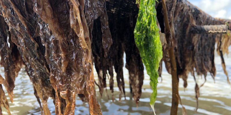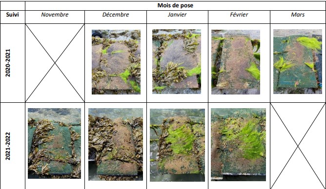 L’autre méthode de production passait par une phase de micro-écloserie. A partir de souches locales, les premières phases de l’écloserie effectuées au CEVA ont permis d’aboutir à l’ensemencement des poches ostréicoles. Ces poches ont ensuite pu être déposées sur la concession expérimentale du SMEL, située à Gouville-sur-Mer, et donnée des résultats supérieurs au captage naturel ou provoqué sur des poches dédiées en 2022 (année peu propice au captage et au développement de Porphyra sp.)